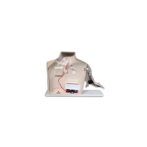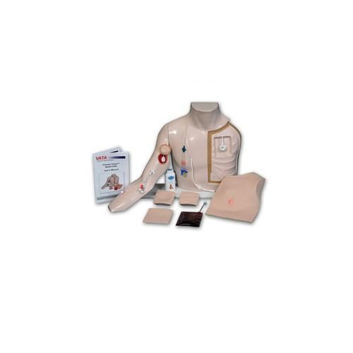 The left side of the chest has an implanted port. Using the various tissue flaps provided, difficult insertions can be practised: deep, slanted, slipped or wandering ports.