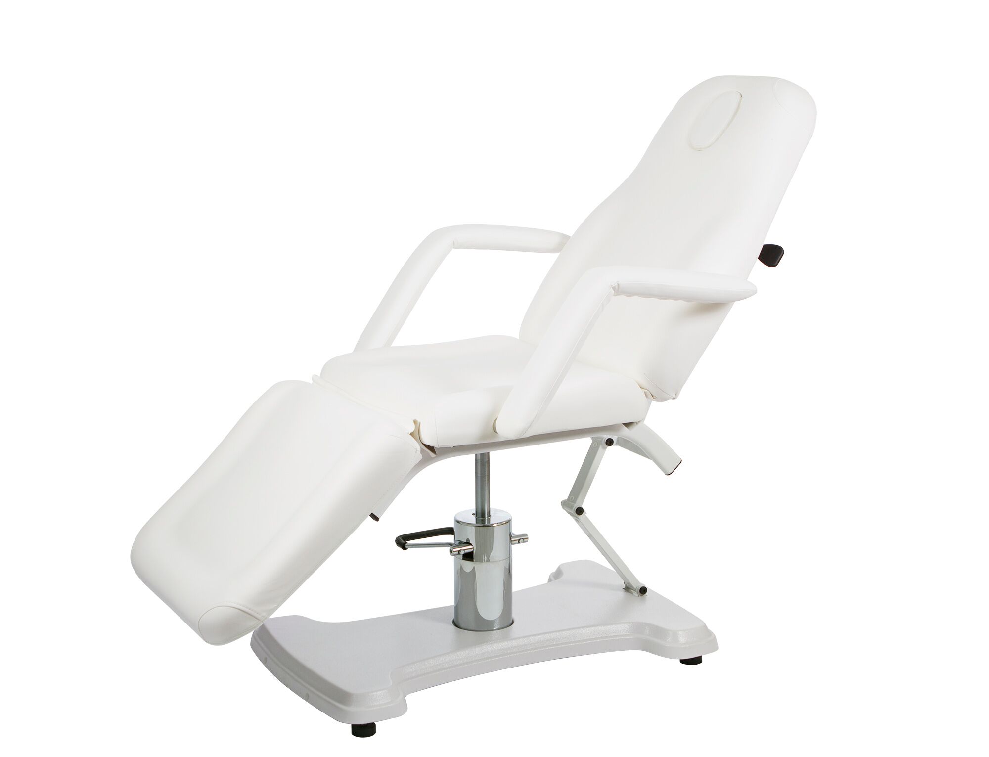 Scaun funcțional și înalt stabil cu 3 secțiuni cu o pompă hidraulică care controlează înălțimea. Înclinarea spătarului și a tetierei se poate regla prin ridicare pe gaz. Cotiere detașabile. Tapițerie din PU albă de înaltă calitate, care ușurează curățarea.