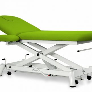 Canapea de examinare hidraulică din 2 secțiuni cu înălțime verticală și fără mișcări orizontale, șinele laterale de susținere, un suport pentru role de hârtie, un dop pentru orificiu de respirație și roți retractabile.