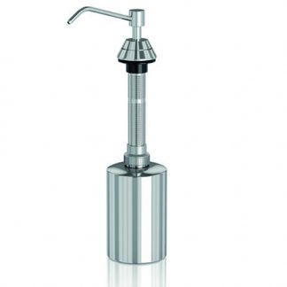 This counter mounted soap dispenser consists of a white container made of blow moulding polyethylene, an AISI 304 stainless-steel head with a polished finish and a shank made of black ABS. The container holds